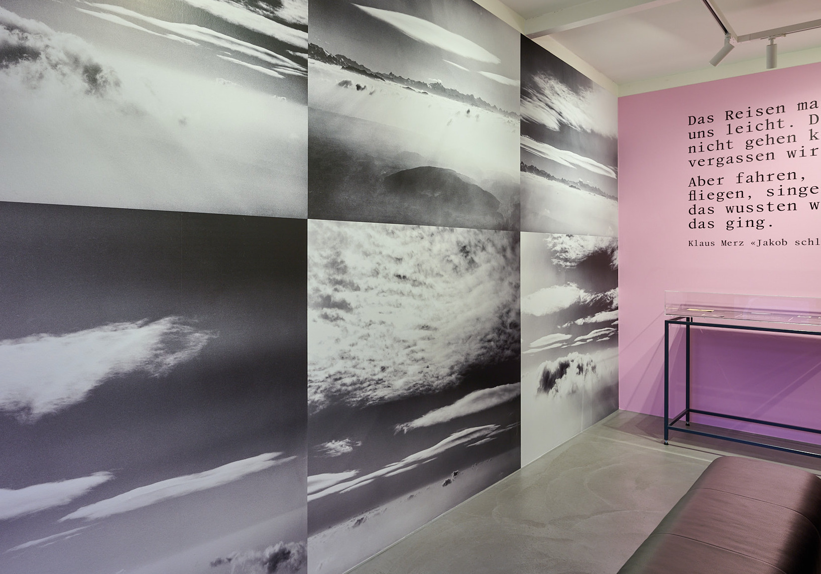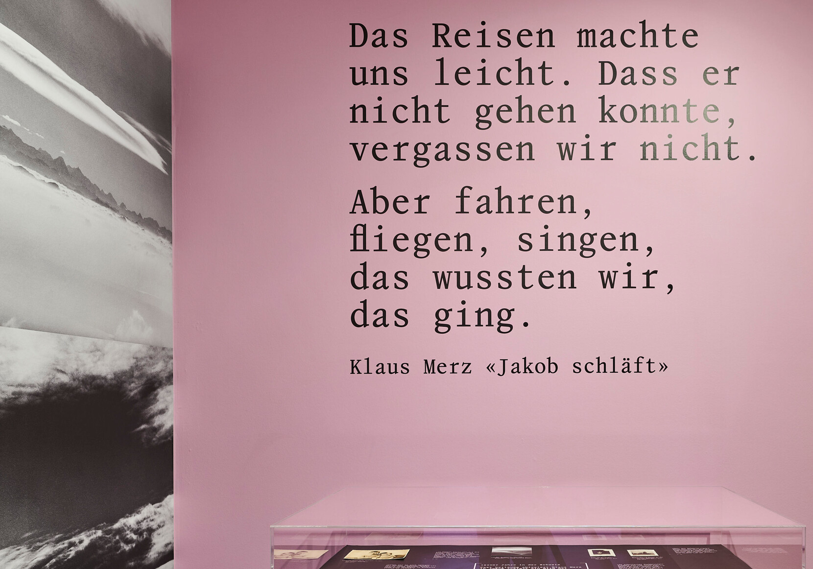 Die Ausstellung bietet heutige Sichtweisen und spricht alle Sinne an: mit Videos, einem Hörfeature und wandfüllenden Luftaufnahmen aus dem Aargau. Wie im Fluge lässt sich die Landschaft erkunden, die für Klaus Merz Heimat und Inspiration ist. Jüngere Autor:innen, eine Philosophin und die Übersetzerin kommen zu Wort. Manuskripte und Dokumente zeigen die Bezüge zur Familie und den langen Schreibprozess. Zu entdecken gibt es auch die Dichterbrüder Klaus und Martin Merz.