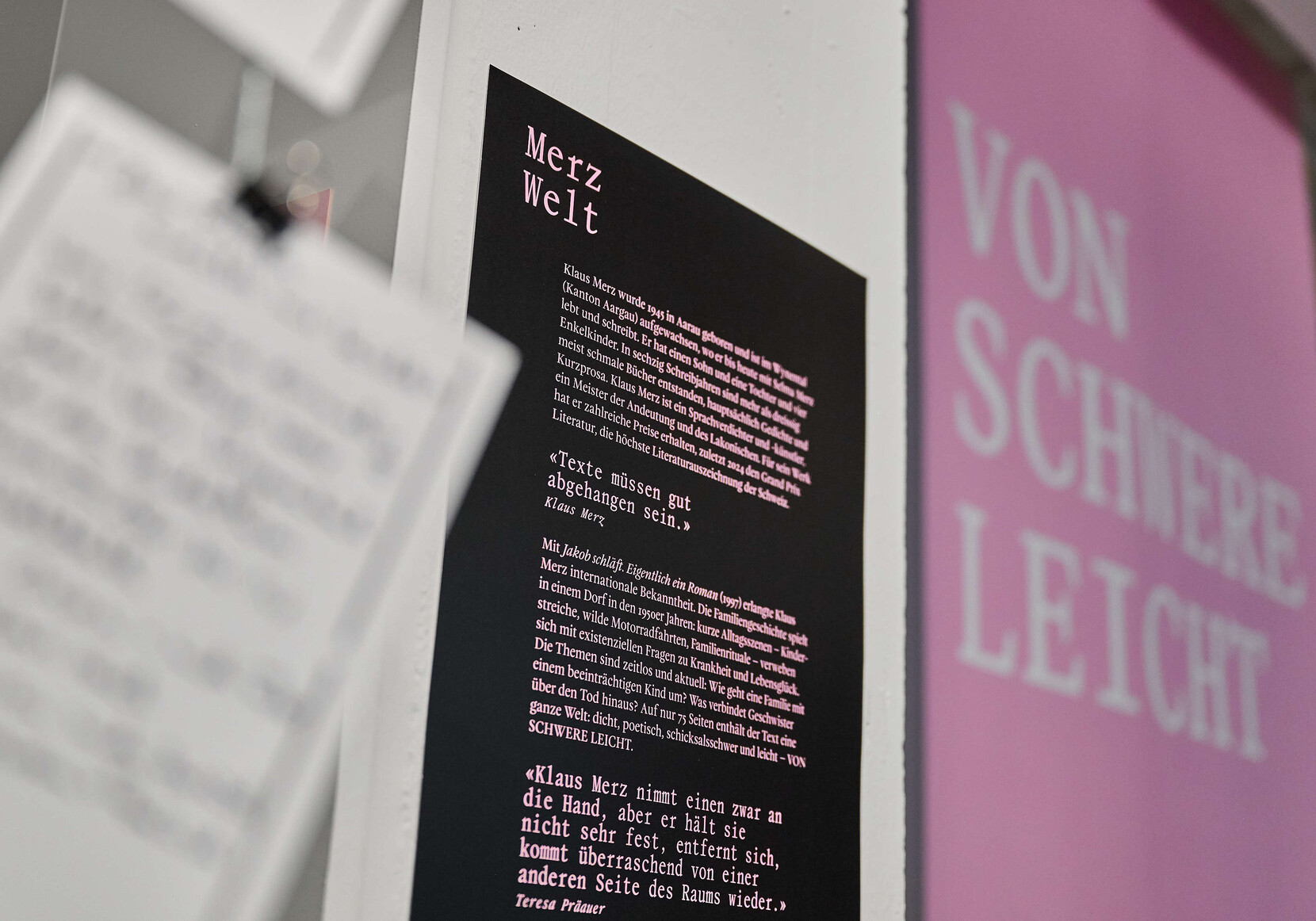 «Klaus Merz gilt als der grösste lebende Lyriker der Schweiz. Höchste Zeit, den mehrfach preisgekrönten Dichter im Hinblick auf seinen 80. Geburtstag kennenzulernen. […]. Die Ausstellungen mit Kunst aus der Sammlung Merz, Videos und Hörfeatures machen die Literatur sinnlich erfahrbar.»
